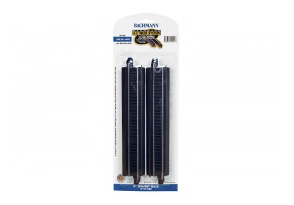 Steel alloy track with black roadbed; 4/card Four pieces of 9” Straight Track build 36” of railroad.