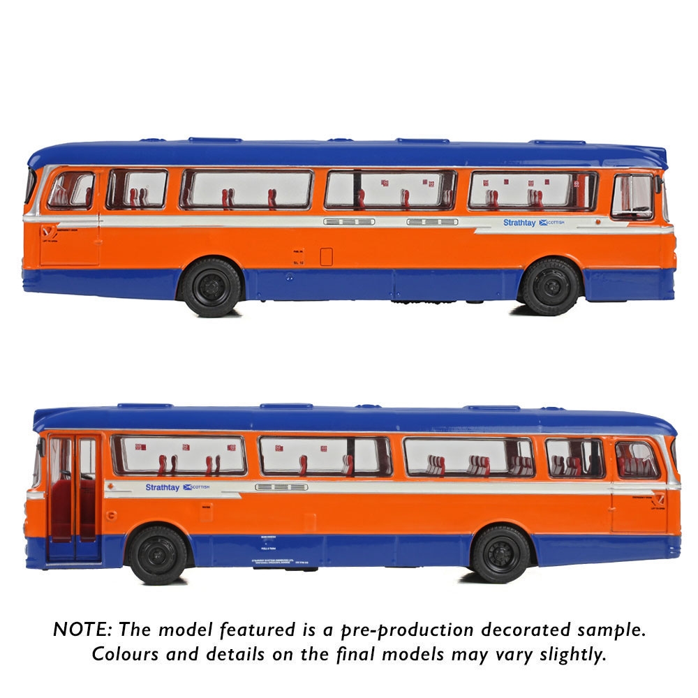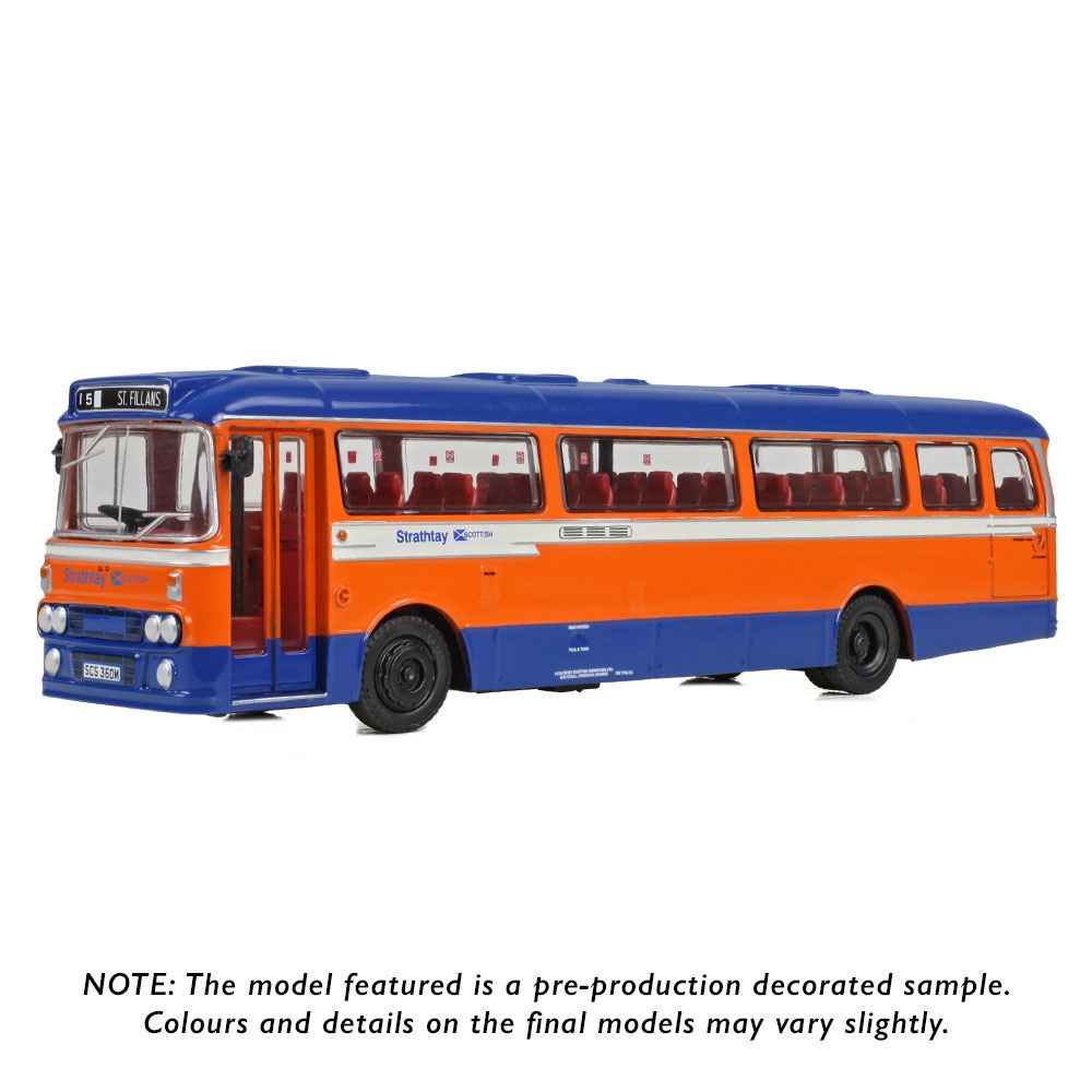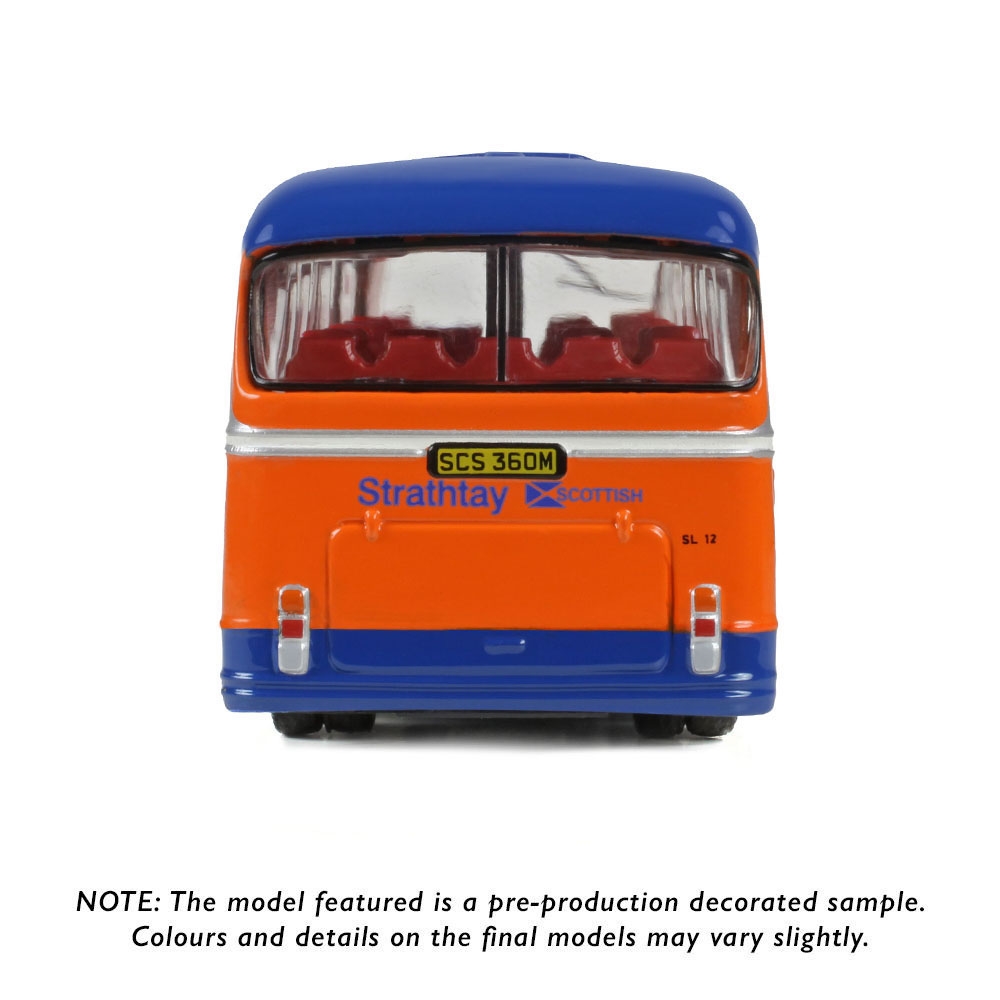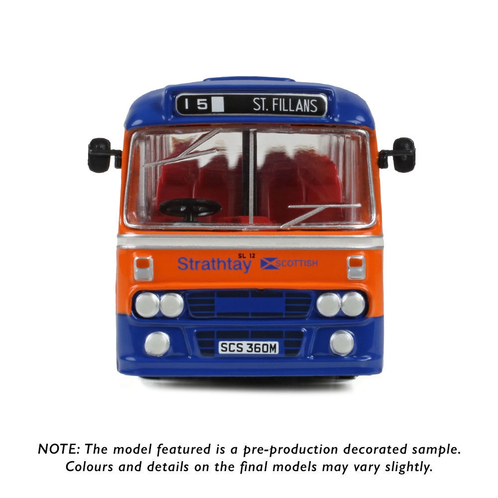 Our model depicts Strathtay Scottish fleet number SL 12, registration SCS360M; an AY-Type bodied Leyland Leopard built in 1975. It was part of a batch of 43 dual purpose 49-seaters that originally operated with Western SMT from new. The model captures it during its time with Strathtay Scottish, wearing full orange and blue livery, complete with 2-leaf doors, as working Service 15 to St. Fillans in Perthshire.