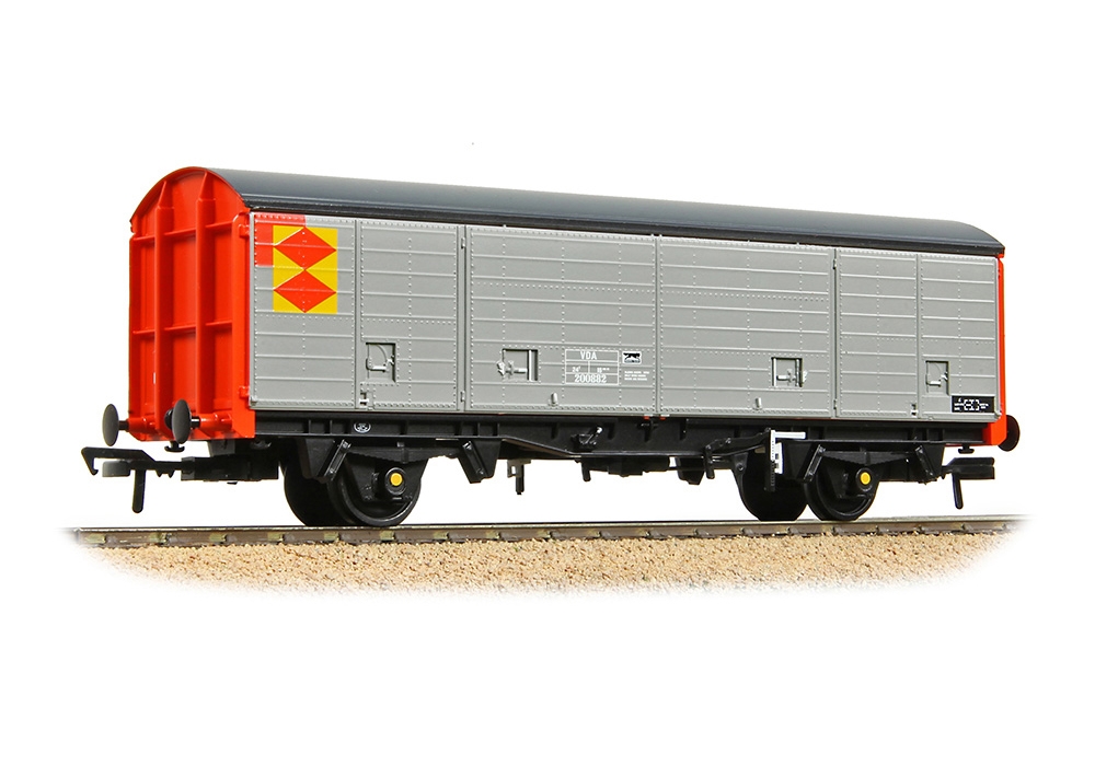 The VDA van was a development of British Rail’s Cov AB air-braked van which was first introduced in the late 1960s, with the VDAs entering traffic from 1975. Sharing the same 20ft 9in wheelbase as the original Cov ABs, the VDAs not only had sliding doors to allow the sides to be fully opened for loading/unloading but these doors could also be opened individually as cupboard doors to allow quicker access to just one internal area. The vans entered traffic in Speedlink services and were used to transport general merchandise, often being marshalled into mixed goods trains as opposed to being operated as uniform rakes and could carry all manner of general merchandise. By the 1980s their traffic was reducing and so many VDAs were rebuilt to suit new traffic, most notably as OTA timber carrying wagons or low sided ballast/spoil wagons where were often coded as ZCA ‘Sea Urchins’.