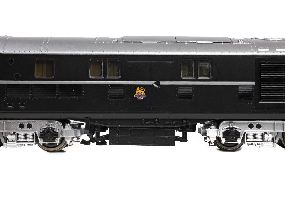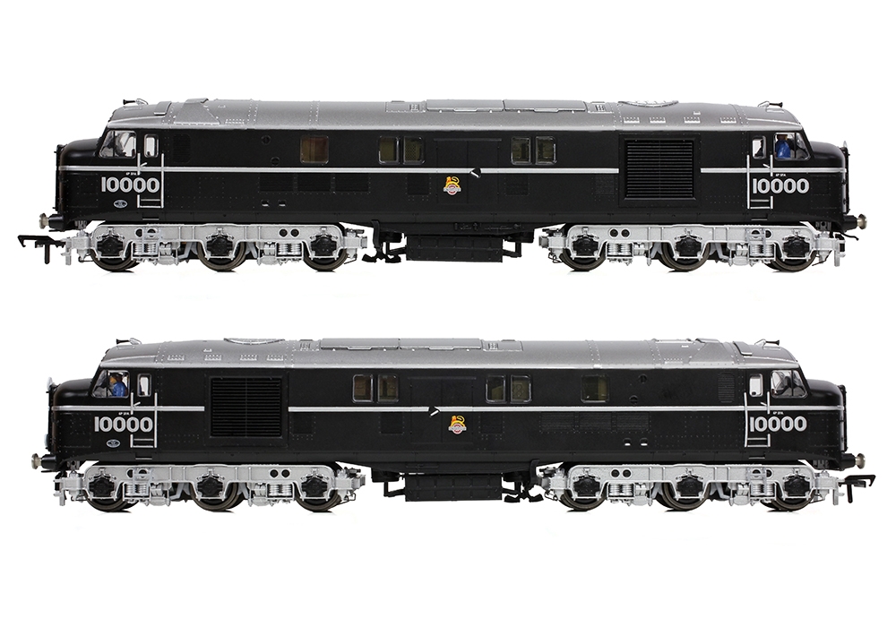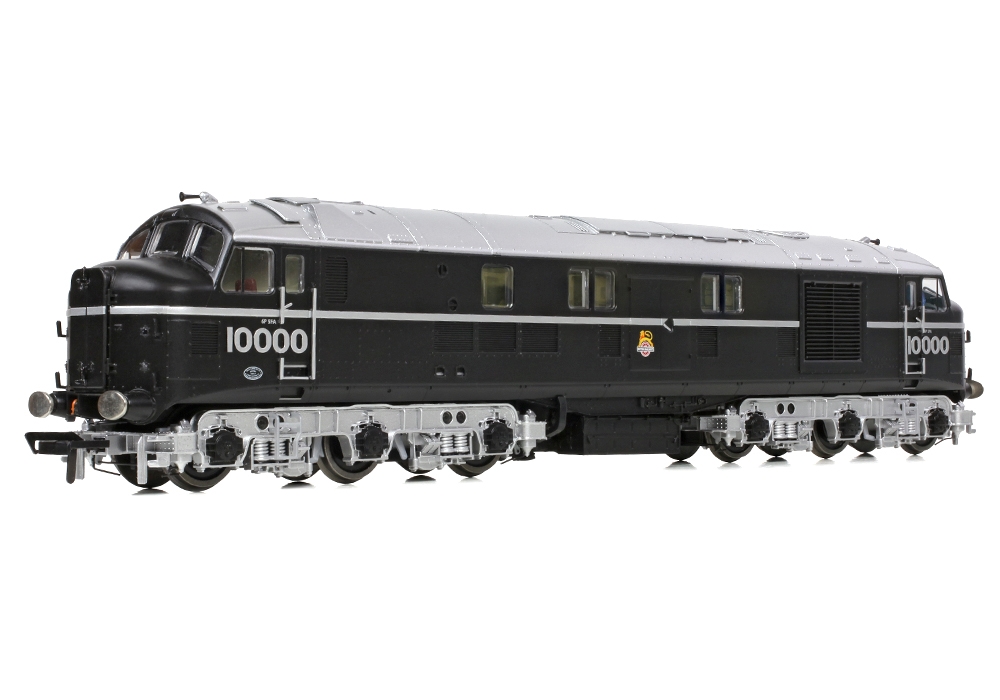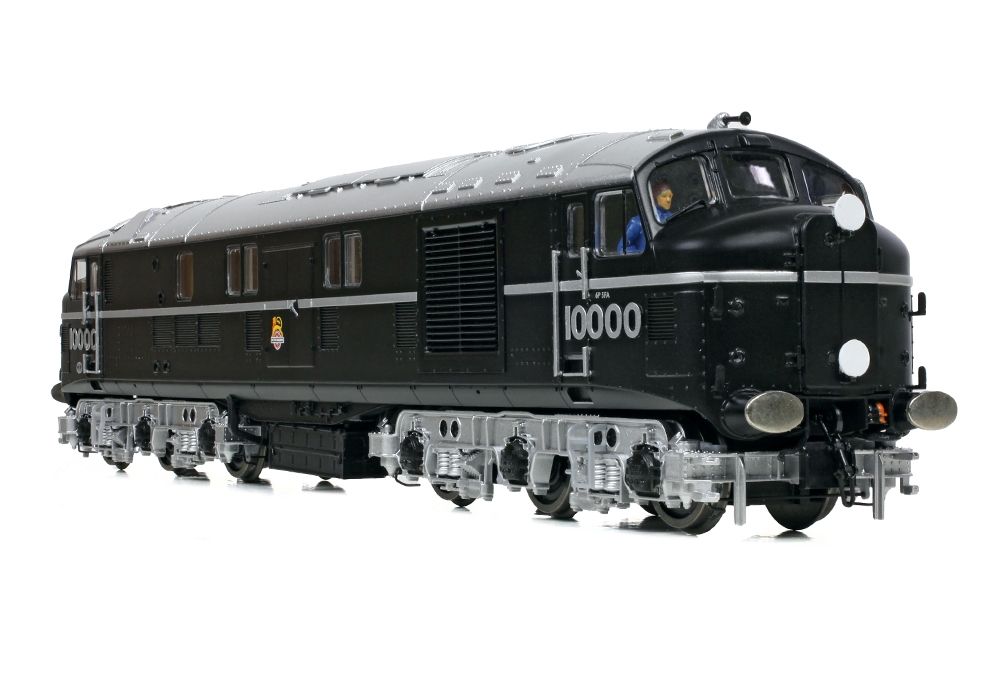Built by the LMS and so becoming part of the Midland Region’s fleet under BR, after five years in traffic the ‘Twins’ were sent to the Southern Region (SR) between 1953 and 1955 for trails alongside the SR’s own prototype diesels. To work on the SR, additional headcode lights and brackets were fitted to suit the Southern 6 position headcode system as displayed on this model of No. 10000, which is depicted in its striking black and silver livery with early emblems.