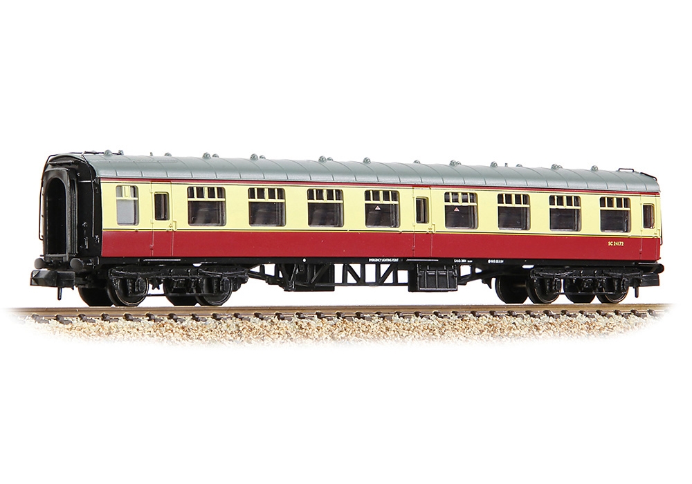 Crowned as Model of the Year when they were first introduced, the Graham Farish Mk1 Coaches continue to provide N scale modellers with a masterpiece in miniature, carrying all the hallmarks of this iconic design. The distinctive profile of the Mk1 coach is captured to a tee and on the roof, the finely moulded ventilators are complemented by separately fitted metal handrails and, where appropriate, toilet filler pipes. On the bodysides each door is complete with hinges, handles and even door bumper details, whilst even the sliding window ventilators are discernible. Footboards are present on the solebars below each door whilst the underframe sports a full complement of equipment, with the truss rod frames modelled in all their glory and flanked by battery boxes, vacuum cylinders, dynamo and, where appropriate, other auxiliary equipment.