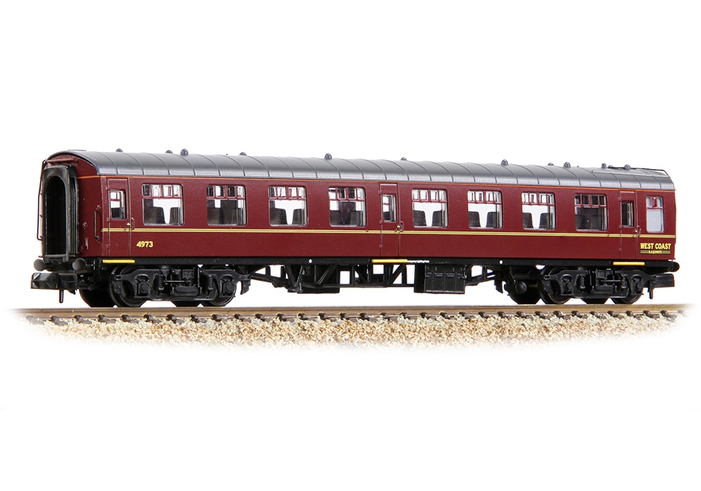 Crowned as Model of the Year when they were first introduced, the Graham Farish Mk1 Coaches continue to provide N scale modellers with a masterpiece in miniature, carrying all the hallmarks of this iconic design. The distinctive profile of the Mk1 coach is captured to a tee and on the roof, the finely moulded ventilators are complemented by separately fitted metal handrails and, where appropriate, toilet filler pipes. On the bodysides each door is complete with hinges, handles and even door bumper details, whilst even the sliding window ventilators are discernible. Footboards are present on the solebars below each door whilst the underframe sports a full complement of equipment, with the truss rod frames modelled in all their glory and flanked by battery boxes, vacuum cylinders, dynamo and, where appropriate, other auxiliary equipment.