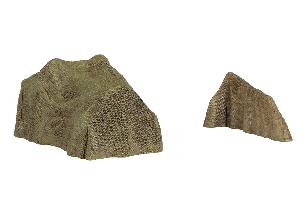 This accessory pack from Scenecraft contains models of a Tractor and Plough covered under tarpaulins. These models are designed to be used as a wagon load but could also be placed in goods depots or stations ahead of their onward travel, or in farmland areas where the equipment is not currently being used and has been covered for protection from the elements.