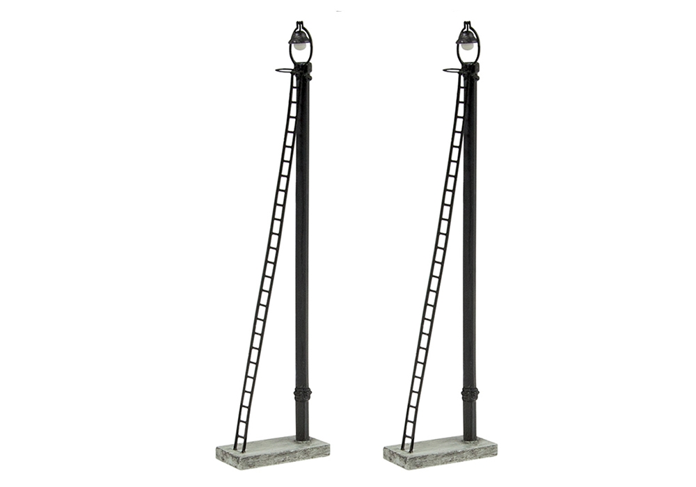 Wooden Post Yard Lamps such as these would have been present in any yard or servicing area for steam, diesel or electric locomotives. The thick wooden lamp posts have ladders for easy access to maintain the lamp itself. These (non-working) lights from Scenecraft can be used on any yard layout.