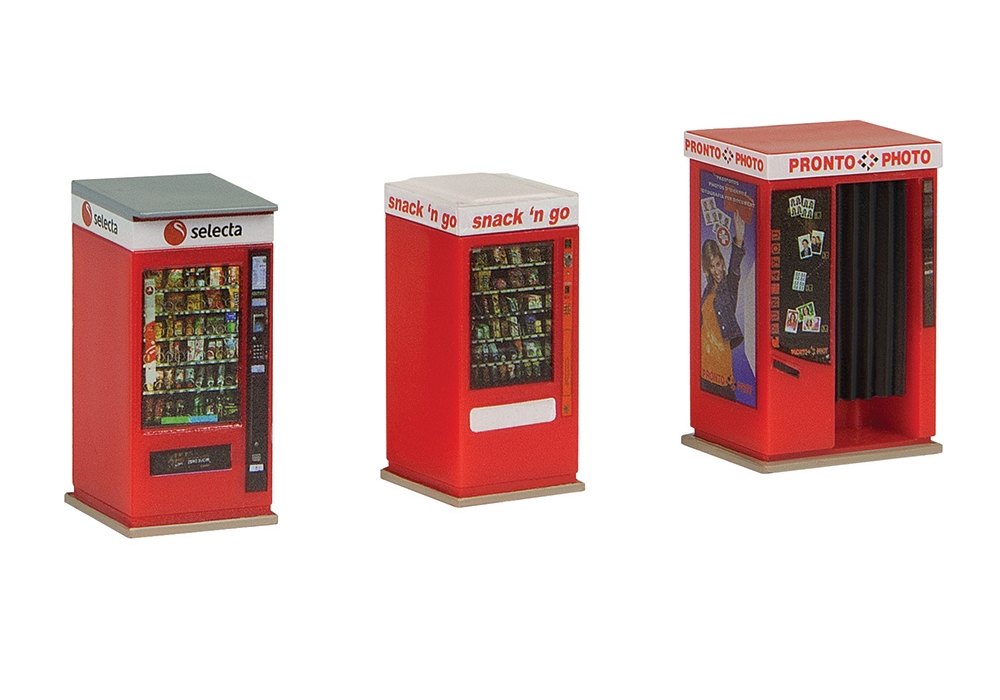 These Concourse Machines will give your layout a modern touch. This pack contains a photo booth and two vending machines of different designs. These machines can be used together or individually not just on station concourses, but also in other locations such bus stations, supermarkets, post offices and town centres.