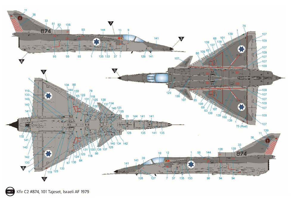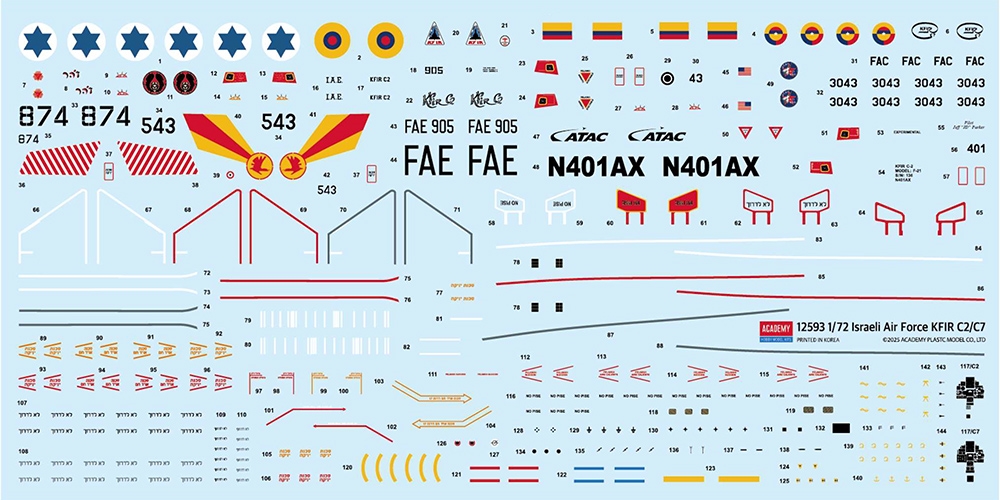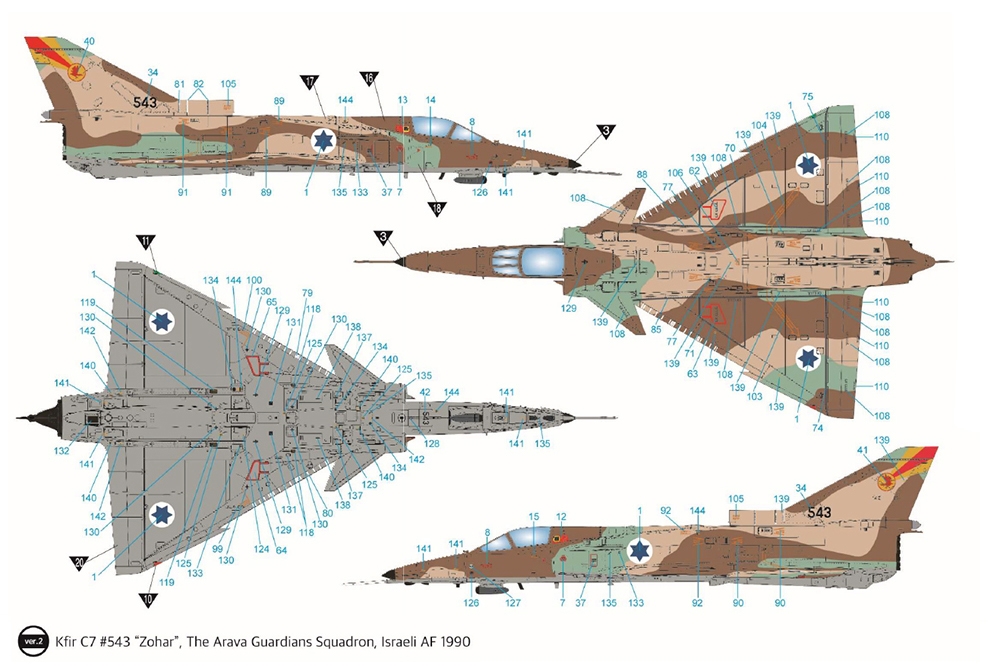 Reissued AvantGarde Model Kit (AMK). Choice of 5 markings: (1) Kfir C2 #874, 1-1 Tajesjet, IAF 1979; (2) Kfir C7 #543 "Zohar", Arava Guardians Sqn, IAF 1990; (3) Kfir C2 N401AX, ATAC, USA; (4) Kfir C2 FAE905, 2113 Sqn, Ecuadorian AF 1998; (5) Kfir C7 FAC 3043, 111 Sqn, Colombian AF.