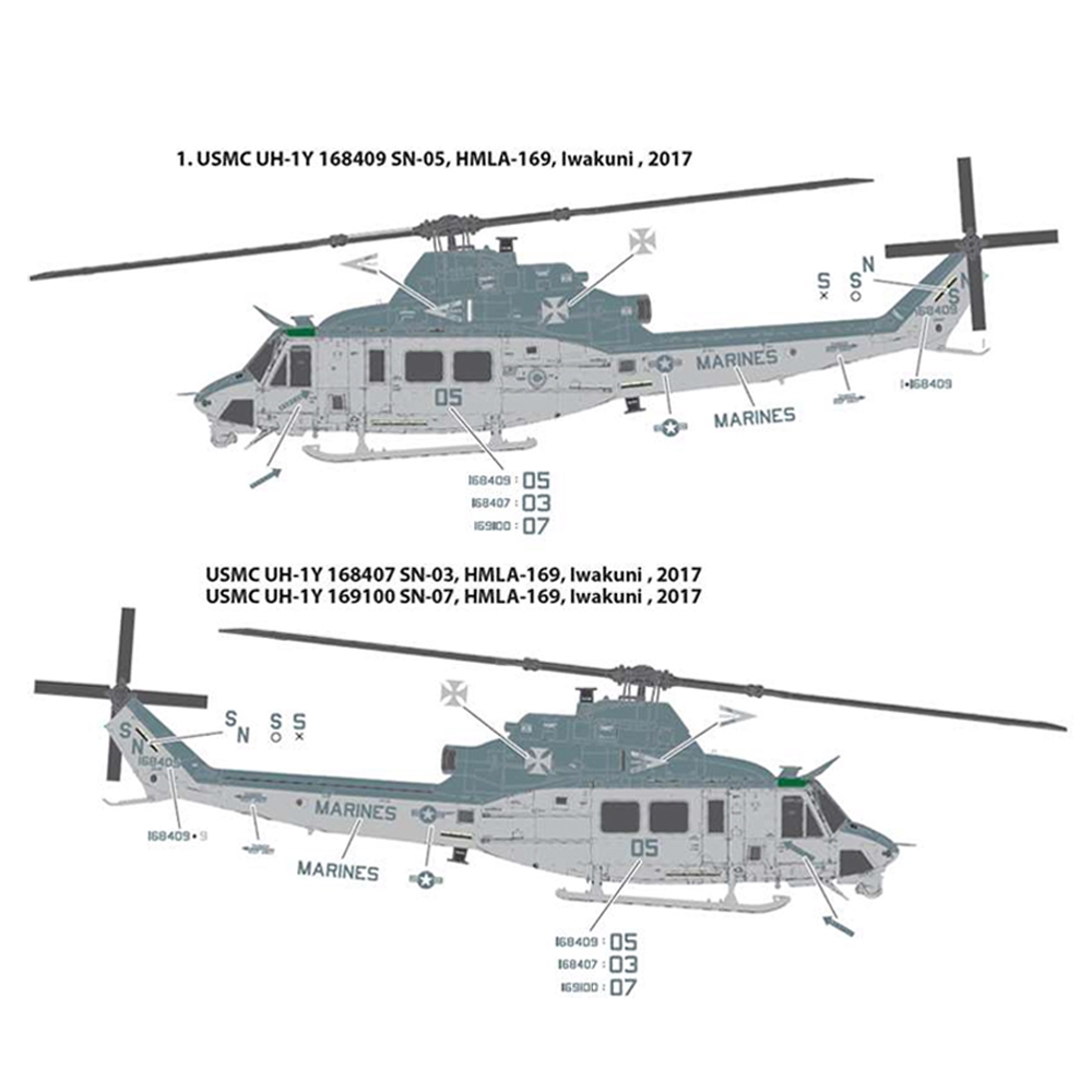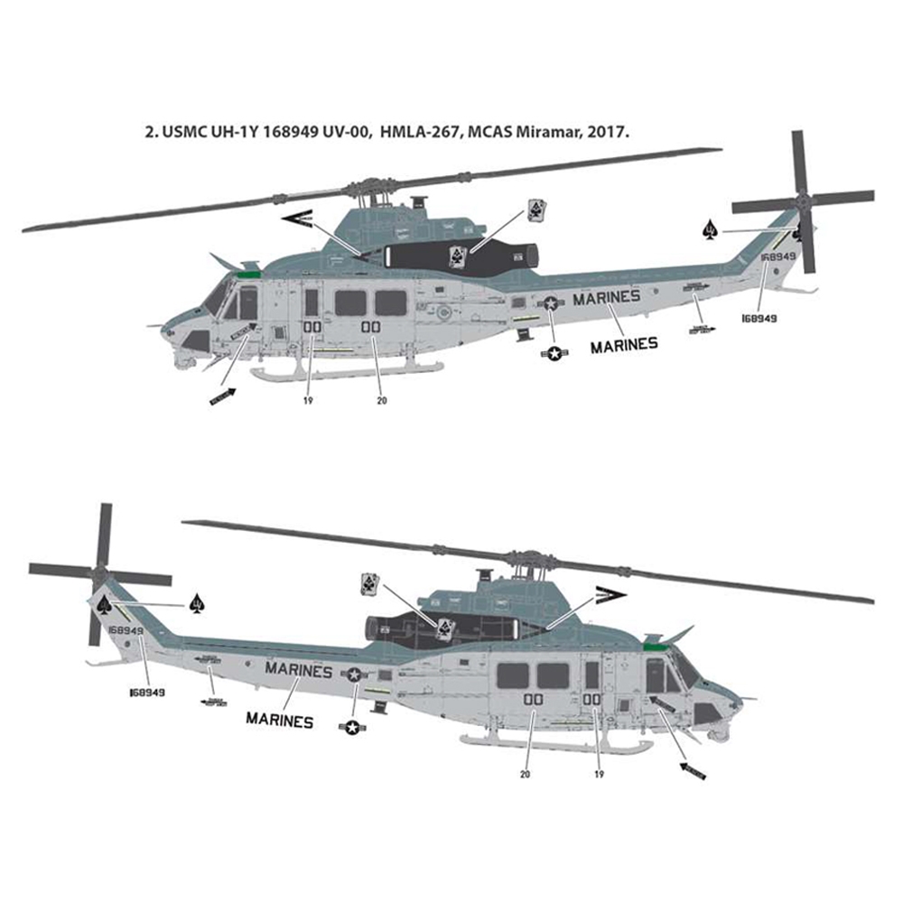 New tooling. 8 sprues with photo-etch parts and paint masks included. Select from 12.7 mm GAU-16 and GAU-17A crew-served machine guns. Boarding doors can be built open or closed. LAU-68 rocket launcher included. Folding rotor blades. Choice of 5 markings for 2017-2020 era USMC aircraft.