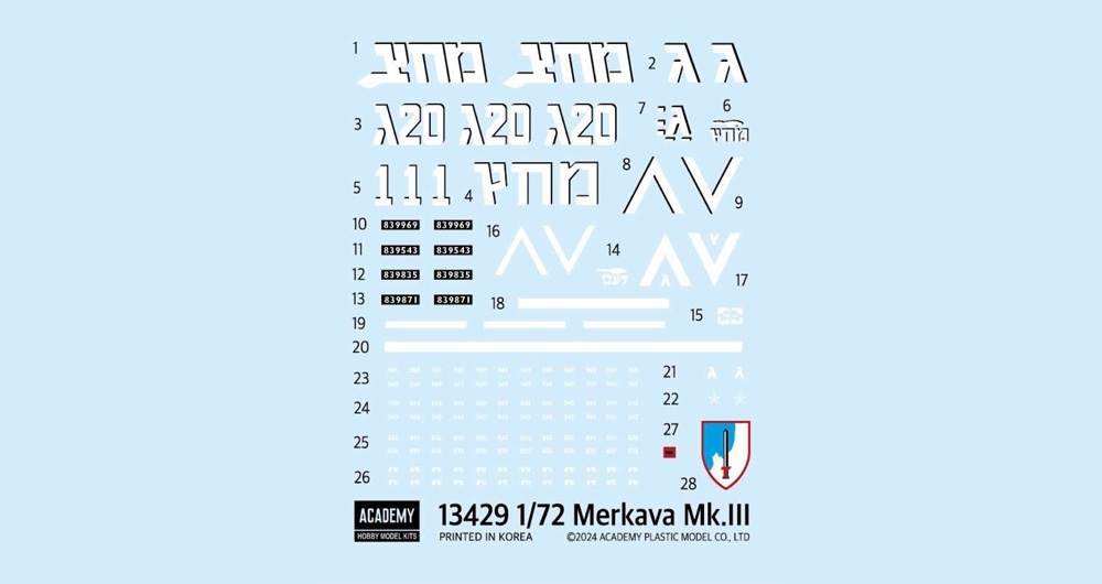 Reboxed Ace Corporation kit. 4 sprues including semi-connected tracks. IMI MG251 120mm main gun, FN MAG 7.62mm GPMG (General Purpose Machine Gun) and M2 heavy machine gun. Choice of markings for 4 Israeli Defence Force tanks. L: 127mm.