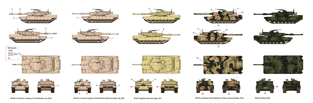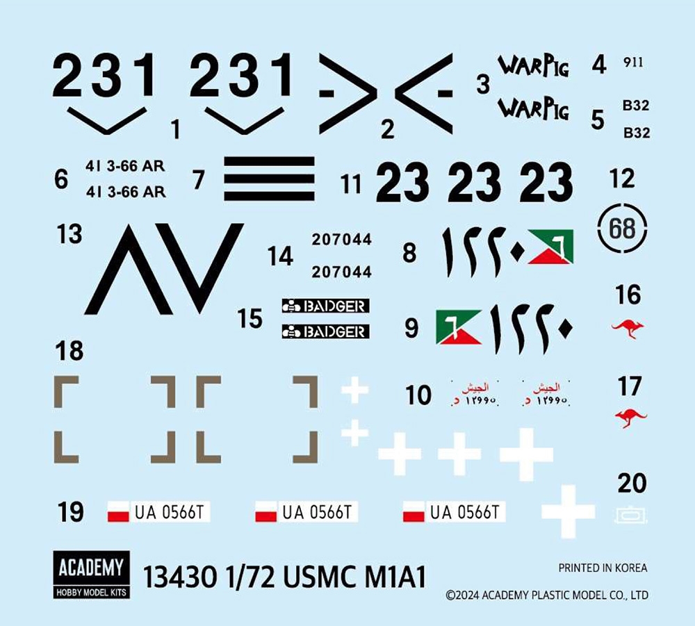 Reboxed Ace Corporation kit. 4 sprues including semi-connected tracks. 120mm M256A1 main gun, 12.7mm M2HB machine gun. Choice of 5 markings: (1) M1A1, USMC C Company, 1st Tank Battalion, Iraq 2003; (2) M1A1, US Army B Company, 3rd Tank Battalion, 66th Armor Regiment, Iraq 2003; (3) M1A1, Egyptian Army, Cairo Egypt 2011; (4) M1A1 Australian Army, B Squadron, 3 Troop, 1st Armoured Regiment, 2015; (5) M1A1, Poland 2023.