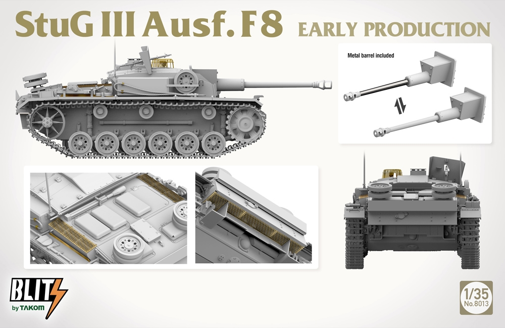 German StuG III Ausf F/8 Early Production, c.1942New Takom BLITZ series model kit of the German WWII Sturmgeschütz III assault gun (StuG III), “F/8” denoting the 8th version of the Panzer III hull.