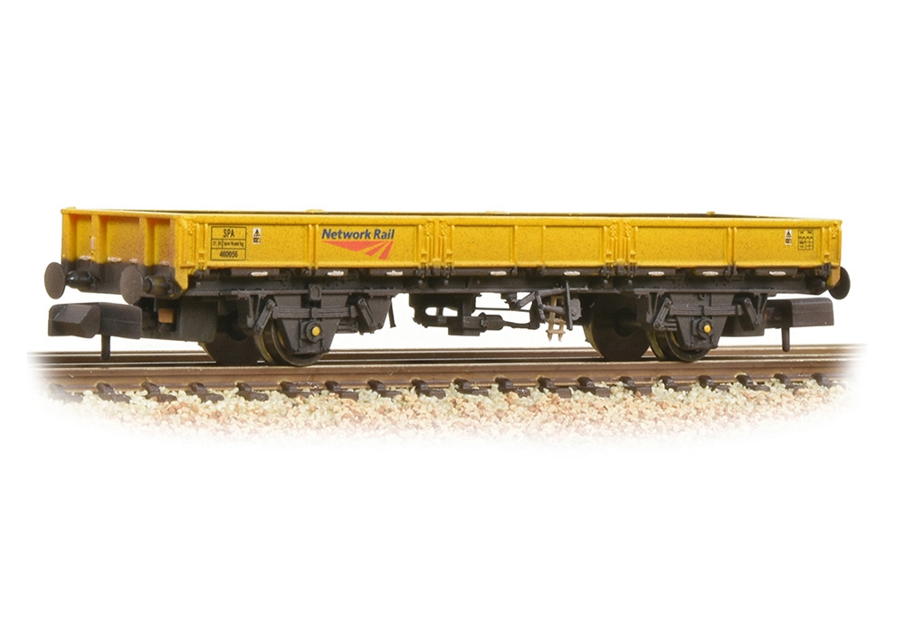 Some 1,100 SPA wagons were built between 1979 and 1981 to carry steel plate wagon. Whilst some later found themselves in departmental use which resulted in a change of TOPS code, by 2005 the number of SPAs still in service stood at 681, 200 of which carried departmental TOPS codes. Alongside wagons in original Railfreight livery, some received repaints into modern schemes like EWS and Network Rail – the latter depicted by this model.