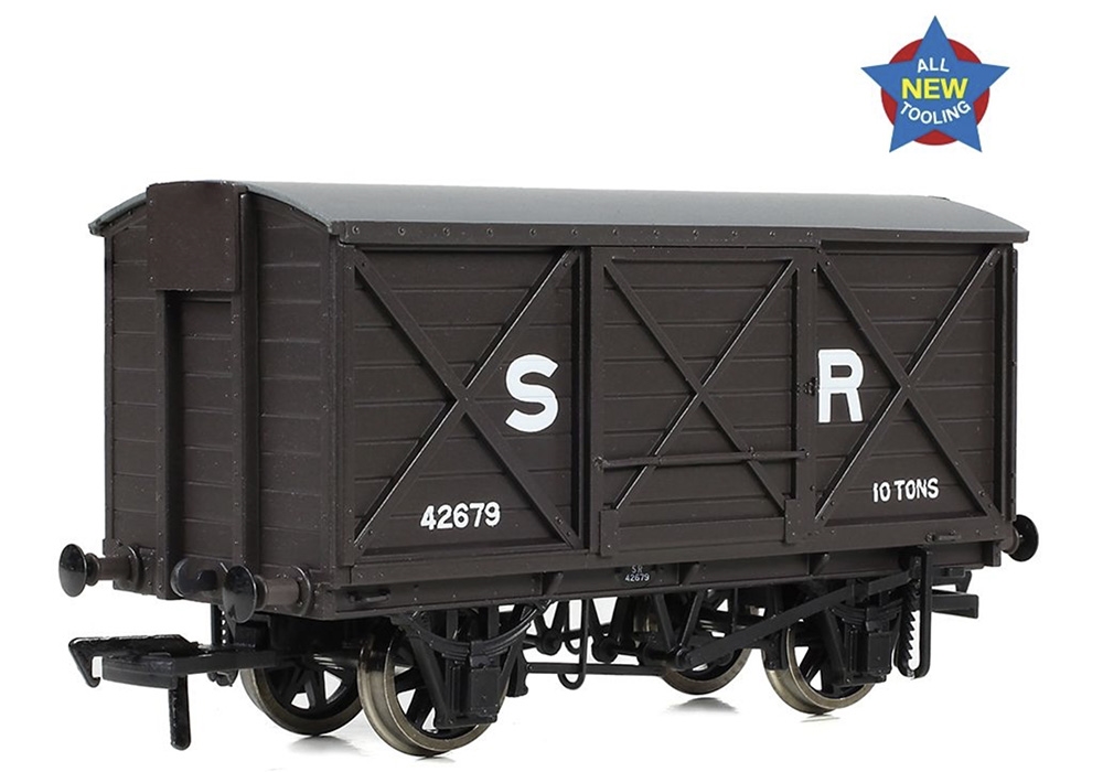The Diagram 1410 van was the most numerous ventilated van built by the London & South Western Railway (LSWR). Construction began in 1885 and more than 1,000 were built, with various detail differences introduced over the lifetime of the vans. These characterful vehicles feature outside framing, sliding doors and were built with a reduced height when compared with vans built later on. This particular model depicts one such Diagram 1410 van in early SR livery (large lettering – pre-1936) and is fitted with Freighter brakes, Warner axle boxes and plain tapered buffers. From 1912 the LSWR built further vans to the new Diagram 1406 which were some 7 inches taller than the Diagram 1410, followed soon after by Diagram 1408 vans which featured hinged doors rather than sliding – this allowed the van body to be slightly wider, increasing the payload. Both of these further types also feature in the EFE Rail range.