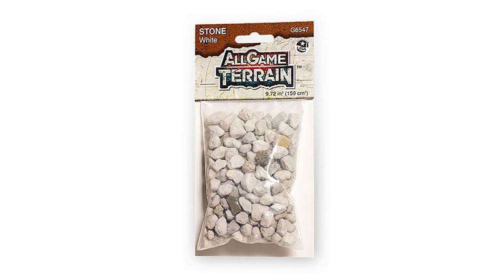 White Stone represents medium to large sized rocks on your miniature base or gaming mat while showing scale for your miniatures. White Stone can be used for stream beds, caves and mountains. Blend multiple colors and sizes of Rocks together to create variation on your terrain feature. Glue White Stone down easily with Game Tac ™.