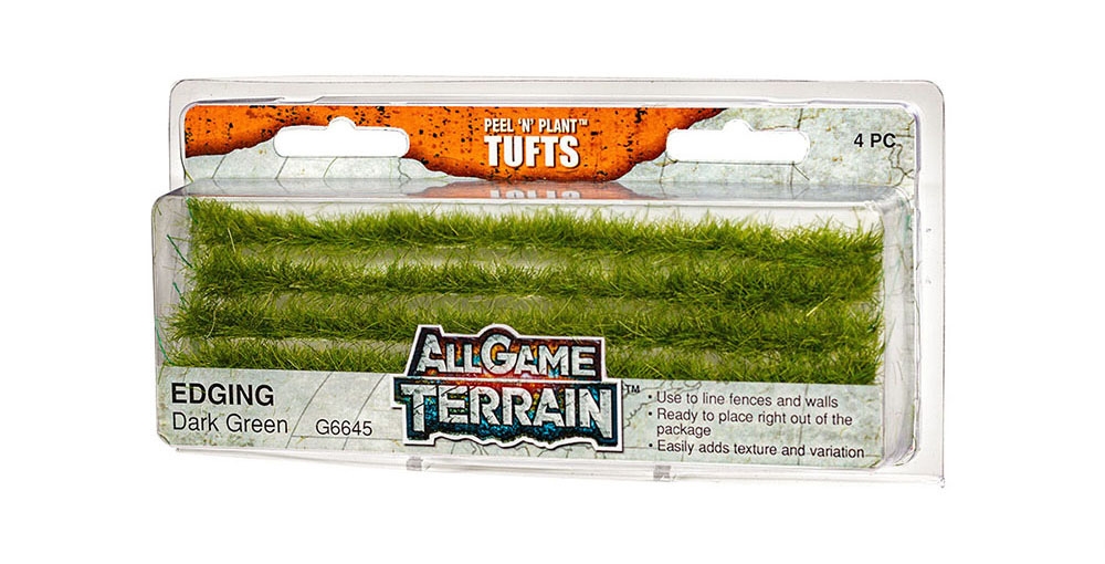 Dark Green Edging is designed to add texture and realism to your terrain feature, miniature base or gaming mat. Dark Green represents grasses in regions with plenty of moisture. Edging can be used along fences and walls to represent over-grown vegetation in abandoned locations. You can also use Edging as barricades. These Tufts are ready to place right out of the package and stick onto your battlefield or gaming mat.