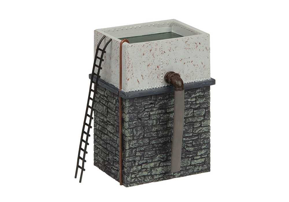 Water Towers were used to collect and store the water that would be used to power steam locomotives. This model from Scenecraft features a water tank mounted on a stone base with a ladder leading to the tank. It could be placed at a station or railway yard on any OO or OO9 layout.