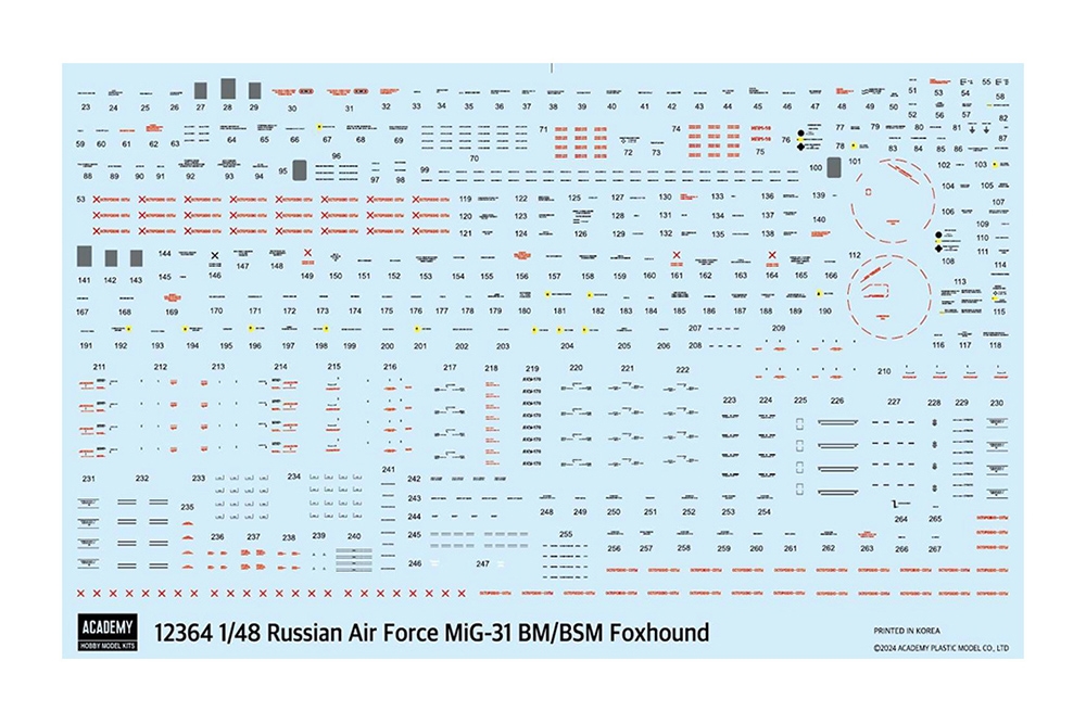 Reissued AvantGarde Model Kit (AMK). 30 sprues include R-33 “AA-9 Amos”, R-73 “AA-11 Archer” & R-77 “AA-12 Adder” missiles. Photo-etch parts. Comprehensive decal sheet contains markings for 4 aircraft.