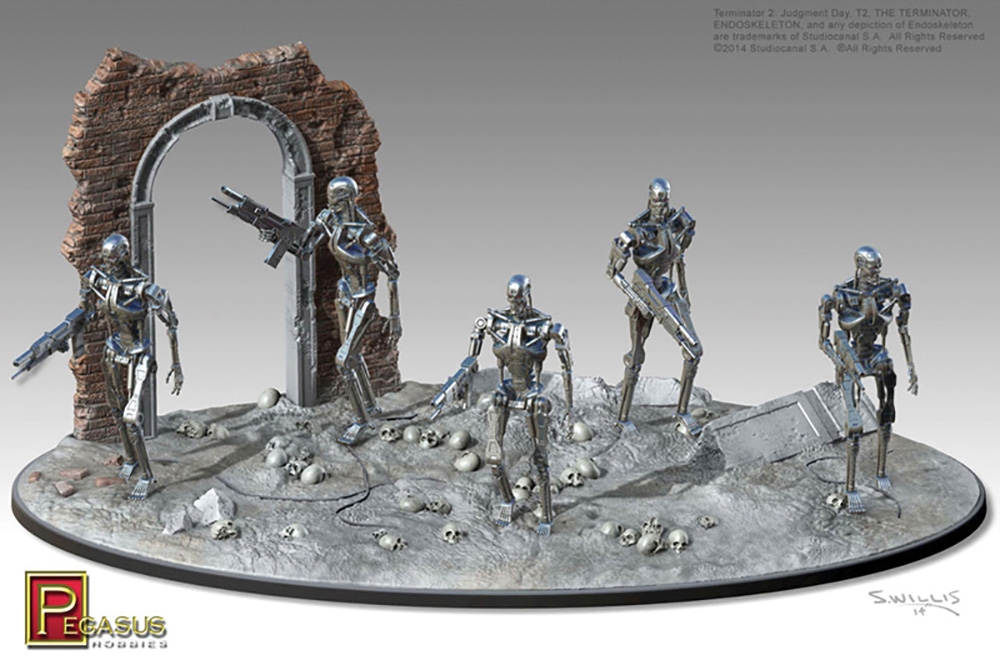 • Set of five 1:32 scale Terminator T-800 Endoskeletons (4”/10cm high)• Complete with Diorama Base• 1:32 scale plastic model kit from Pegasus, requires paint and glue