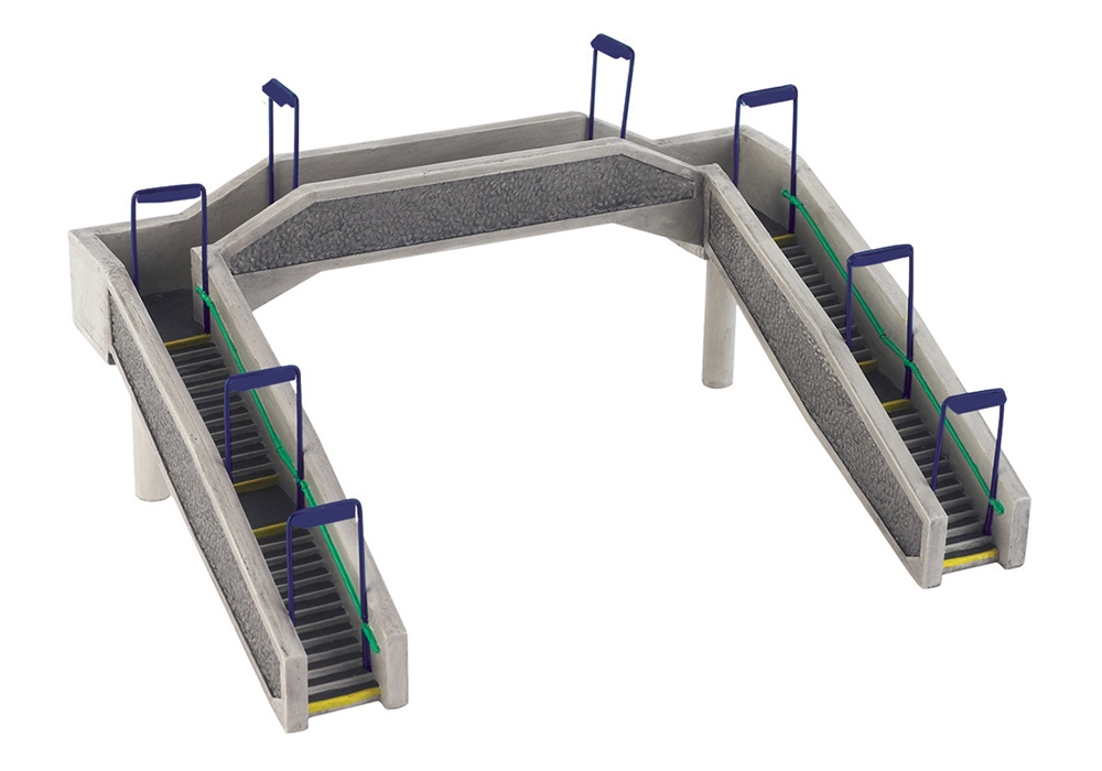 This Scenecraft model depicts a Concrete Footbridge commonly used at railway stations across the country, making it suitable for layouts set in many areas and eras. Each flight of stairs has the first step painted yellow, a sign of the health and safety team at work, meanwhile handrails are individually painted as are the (non-functional) lighting gantries which on this model are decorated in blue.