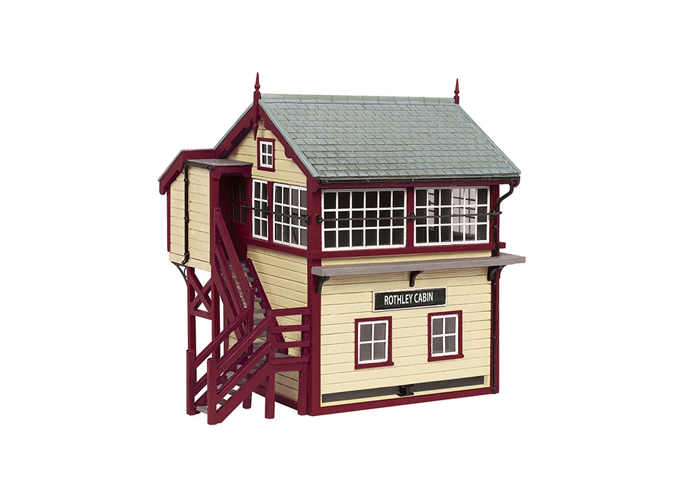 Based on the signal box at Rothley Station on the Great Central Railway, this Scenecraft model is decorated in the red and cream colours that would have been used on a real GCR Signal Box during the BR period when the London Midland region operated the former GCR route.