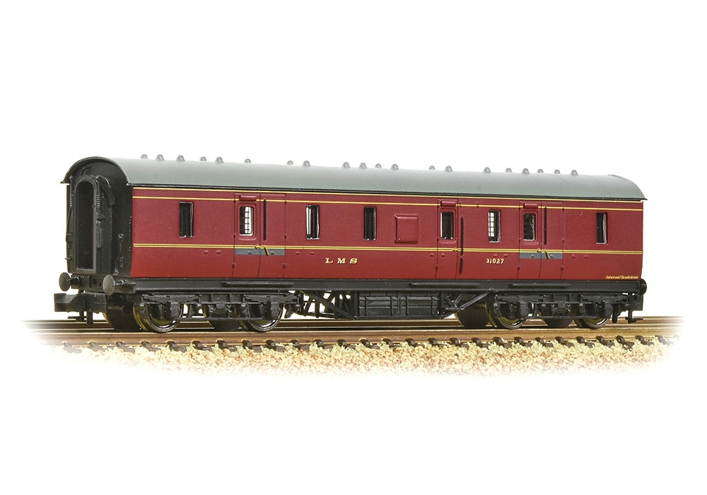 The Graham Farish model captures the look of Stanier’s design to a tee, with a high fidelity bodyshell featuring expertly moulded handrails, door handles, hinges and even door stops, all replicated crisply on the bodysides. At either end, the LMS pattern gangways are added, whilst end steps are fitted alongside and a metal handrail is included adjacent to them and metal buffers are fitted below. Each window is flush glazed and inside, the guard’s compartment is modelled along with the hand brake wheel. Footboards are fitted along the solebar, below which vacuum brake equipment is present along with the battery boxes, dynamo and other auxiliary gear. The bogies are fitted with metal wheelsets, whilst the standard N scale coupling is attached via a NEM coupling pocket to the close coupling mechanism that is fitted to the carriage floor, which operates in tandem with the bogie. Like any Graham Farish model, this high level of detail is brought to life through the livery application, using authentic colours, logos and fonts making every model a masterpiece in miniature.