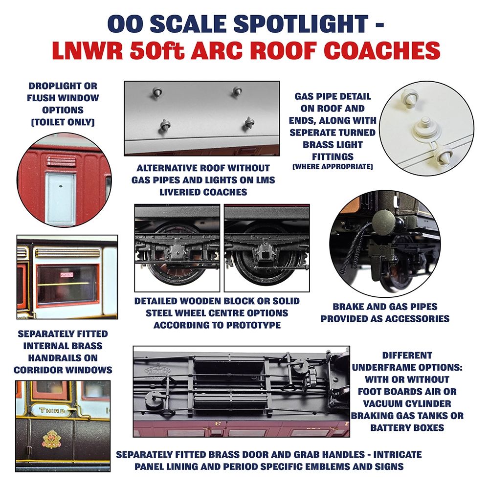 The Bachmann Branchline OO Scale models have been developed through meticulous research which has drawn upon the expertise of the London & North Western Railway Society and the M&GN Circle, to whom we offer our sincere thanks. With a comprehensive tooling suite, each of the four vehicle types can be modelled in various configurations depicting coaches at various points during their working lives.