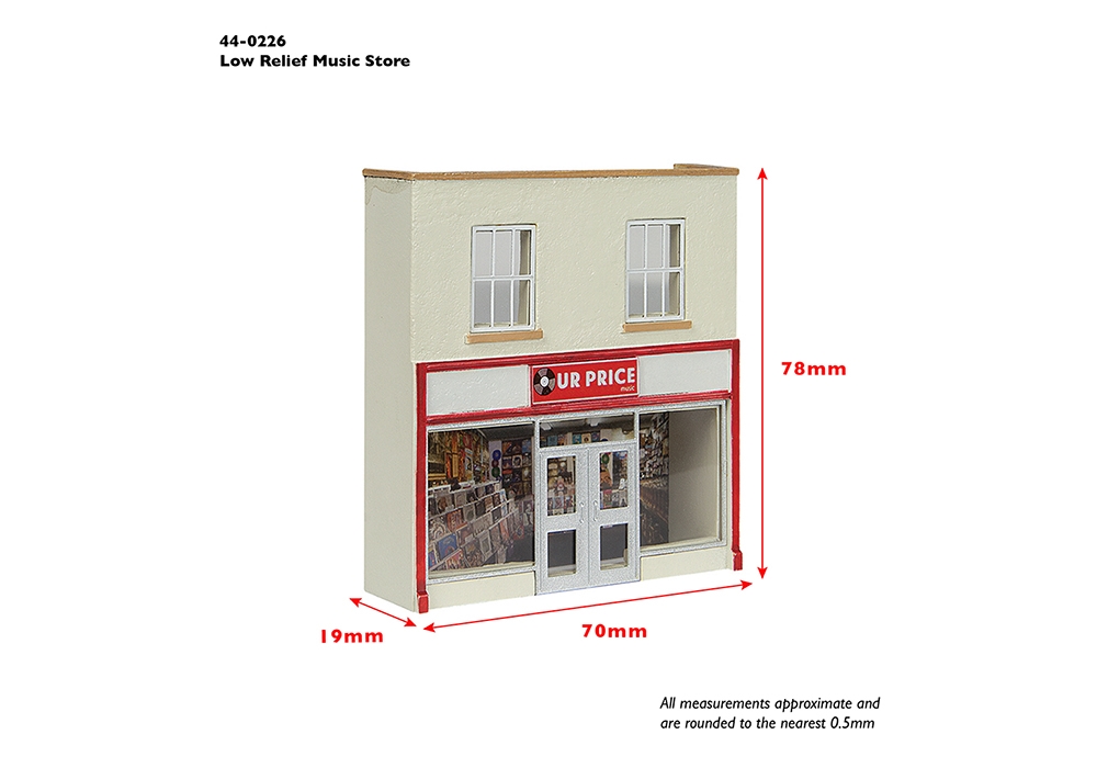 With the rise of streaming services and online platforms, music stores might be considered old hat nowadays, but many of us recall happy visits to the local store to buy the latest records so why not give your miniature music lovers the perfect shopping destination with our low relief music store. Featuring etched metal windows and doors, the clear glazing gives way to a tempting view of some of the records currently topping the charts. Crafted in low relief, this model is great for creating a backdrop to any layout or diorama in minimal space and can be combined with other low relief models in the Scenecraft range to create a complete street scene.