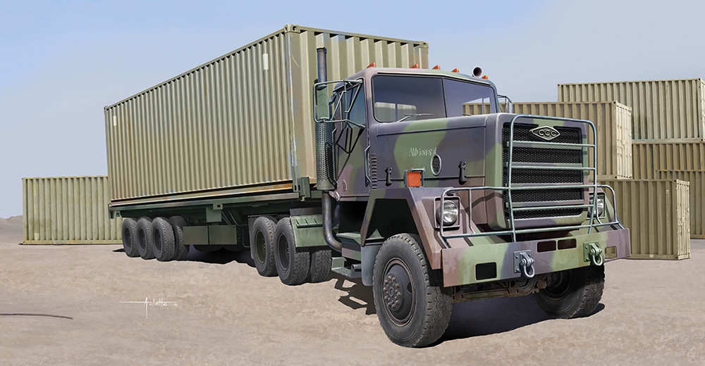 Tractor unit, semi-trailer & one 40ft container included • L: 489mm, W: 94.3mm • Total parts 500+ • 1:35 scale plastic model kit from Trumpeter, requires paint and glue