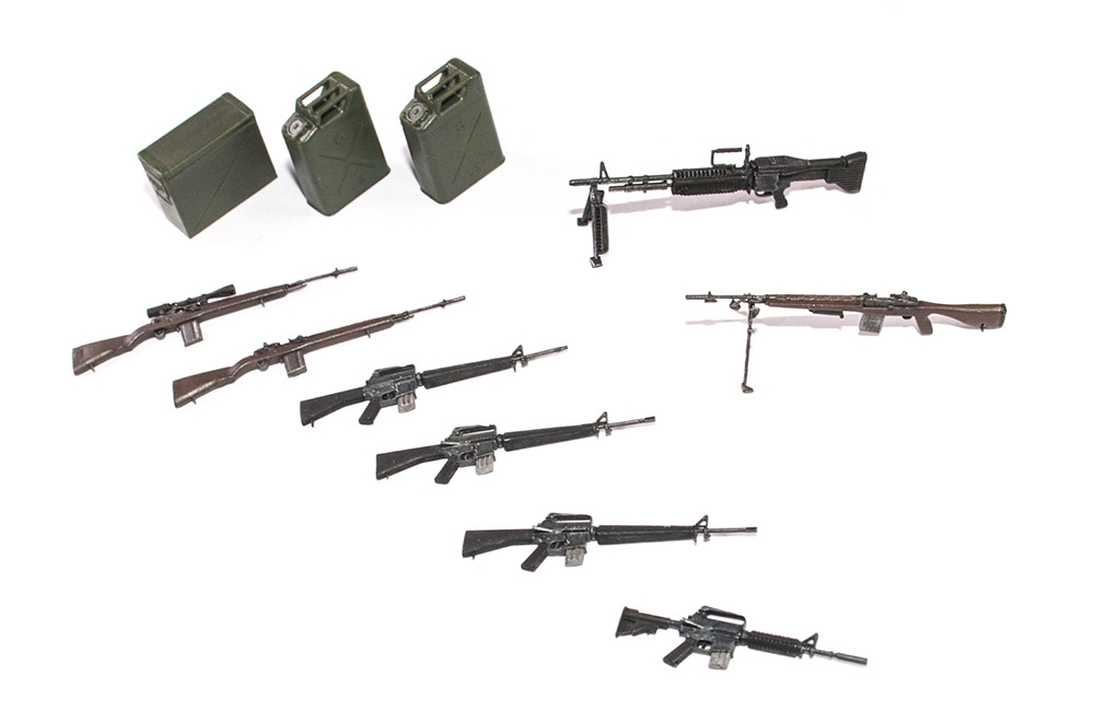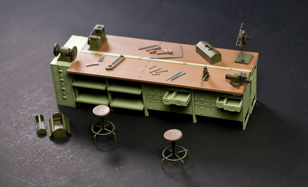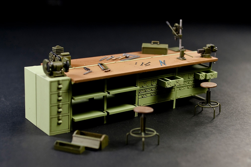 New plastic injection kit includes 2 workbenches, 2 drawers (position open or closed), 2 stools, assorted hand tools (screwdriver, pliers, wrench, hammer etc), machine tools (bench clamp, grinder, drilling machine, air compressor), jerry cans, ammo box, photo-etch saw blade, wrench and toolbox.
