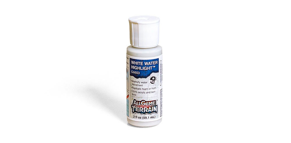 White Water Highlight™ is used to replicate foam or froth to a water feature on your miniature base, terrain feature or gaming mat. Use to intensify movement for fast-moving water. White Water Highlight is water soluble
